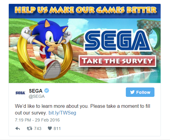 SEGA esta pidiendo ayuda a sus seguidores realizando una encuesta, en perfecto inglés, eso sí, así que si te manejas con el inglés, o tienes muchas ganas de que resucite alguna de sus sagas o quieres aportarles ideas y te ayudas con el traductor de google este es tú momento de hacerle valer tú opinión en la que incluso al final de esta, sólo si quieres, puedes dejar tus datos de contacto para que si les interesa tú propuesta puedan comunicarse de algún modo contigo, pero también puedes dejarlo en blanco si te da la gana y no quieres que te puedan contactar.